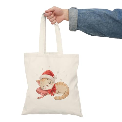 Generic - Tote Bag - شنطة قماش بسوستة – بتصميم قطّة الكريسماس النائمة – تصميم كريسماس لطيف للهدايا والمناسبات – شنطة خروج وتسوق مطبوعة – خفيفة ومتينة وصديقة للبيئة مناسبة للهدايا والجامعة