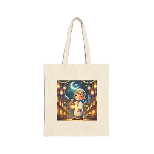 Generic - Tote Bag - حقيبة قماشية بسوسته بتصميم كرتوني لطفل مبتسم يحمل فانوساً في شارع رمضاني مزين بالأنوار - شنطة كتف قطنية لهدايا رمضان، أبيض كريمي متين وعصري.
