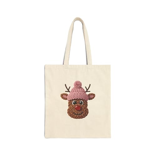 Generic - Tote Bag - حقيبة قماشية بسوسته بتصميم وجه غزال الرنة كروشيه - شنطة كتف قطنية دافئة لهدايا الكريسماس والشتاء، أبيض كريمي متين وعصري.