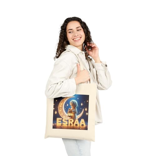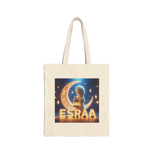 Generic - Tote Bag - حقيبة قماشية بسوسته بتصميم مخصص باسم "إسراء" لفتاة تحمل فانوساً أمام هلال ذهبي مضيء - شنطة كتف قطنية لهدايا رمضان، أبيض كريمي متين وعصري.