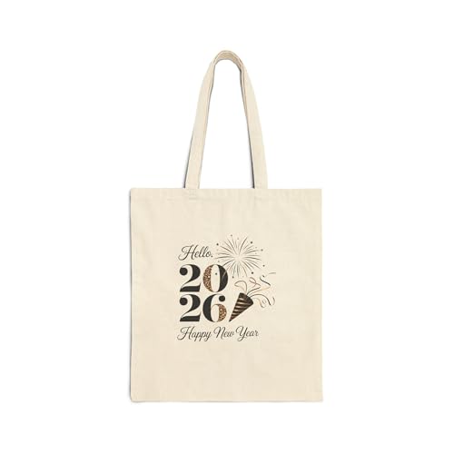 Generic - Tote Bag - حقيبة قماشية بسوسته بتصميم "Hello 2026" ذهبي مع ألعاب نارية - شنطة كتف قطنية فاخرة لهدايا رأس السنة، أبيض كريمي متين وعصري.