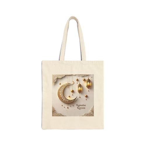 Generic - Tote Bag - حقيبة قماشية بسوسته بتصميم فني فاخر لهلال ومسجد ذهبي مع فوانيس ونجوم متدلية - شنطة كتف قطنية راقية لهدايا رمضان، أبيض كريمي متين وعالي الجودة.