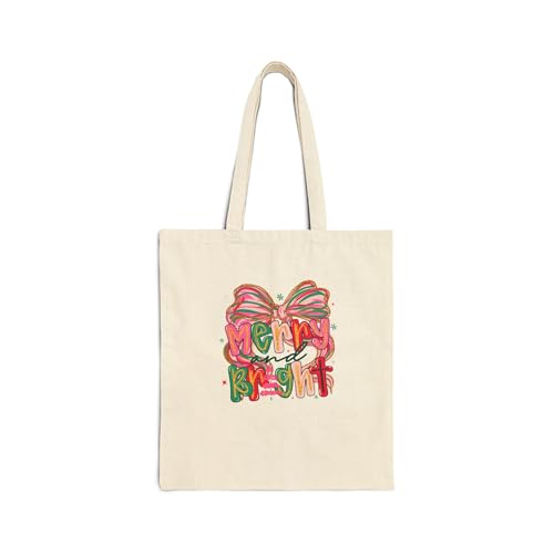 Generic - Tote Bag - حقيبة قماشية بسوسته بتصميم "Merry and Bright" بفيونكة وردية - شنطة كتف قطنية أنيقة لهدايا الكريسماس، أبيض كريمي متين وعصري.