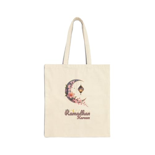 Generic - Tote Bag - حقيبة قماشية بسوسته بتصميم هلال رمضان مزين بزهور الكرز الوردية وفانوس عتيق مع عبارة Ramadhan Kareem - شنطة كتف قطنية أنيقة لهدايا رمضان، أبيض كريمي متين.