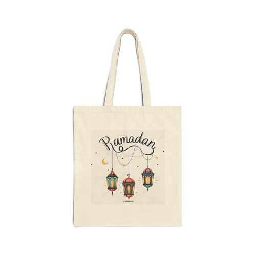 Generic - Tote Bag - حقيبة قماشية بسوسته بتصميم فوانيس رمضان الملونة والمتدلية مع كلمة "Ramadan" بوقار - شنطة كتف قطنية لهدايا رمضان، أبيض كريمي متين وعصري.