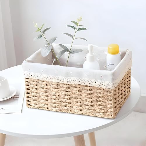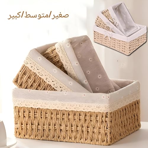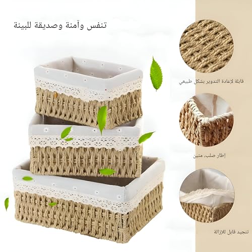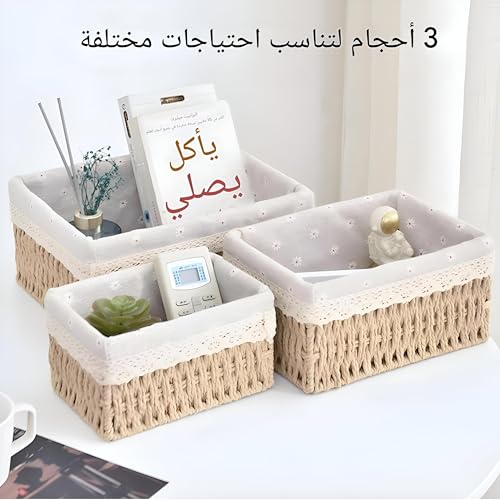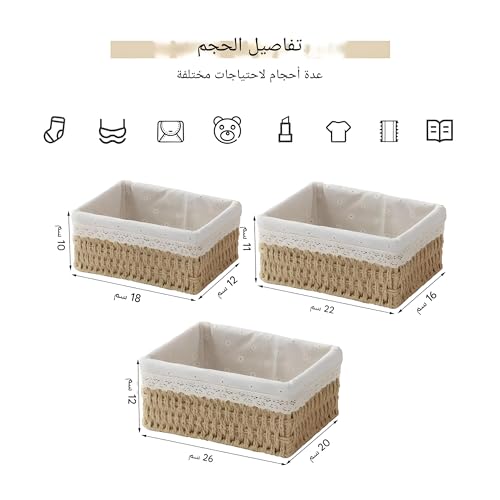 - مصنوعة يدويًا ومتينة: هذه السلال مصنوعة يدويًا على يد حرفيين مهرة مع الاهتمام بالتفاصيل والجودة. السلال متصلة بسلك وكل جانب مثبت بإحكام لضمان عمر خدمة طويل. سلال التخزين مجهزة بقطعة قماش منقوشة قابلة للإزالة، مما يجعل التنظيف سهلًا للغاية