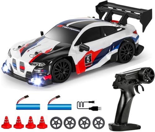 TOYS LAND - سيارة دريفت للتحكم عن بُعد 1:24 بتردد 2.4 جيجا، سرعة عالية 20 كم/س بنظام دفع رباعي 4WD، مع إطارات إضافية وأضواء ليد وبطاريتين قابلتين لإعادة الشحن، للبالغين والأطفال والأولاد 8+ (أبيض) – من تويز لاند
