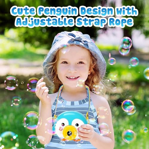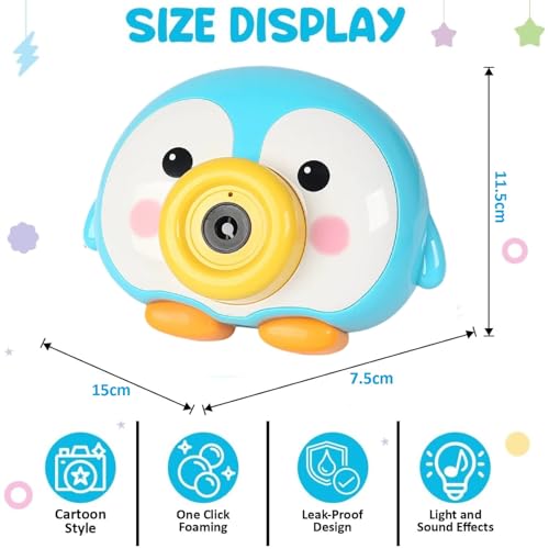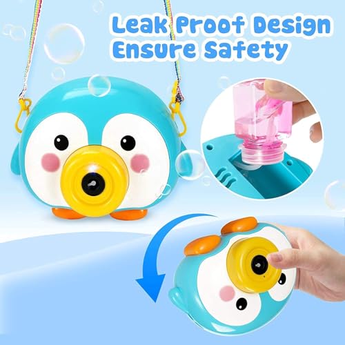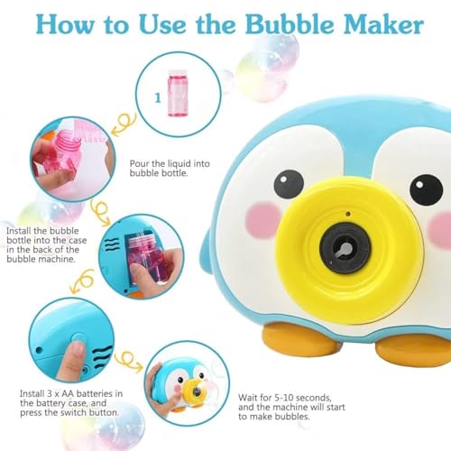 - خفيف الوزن وسهل الاستخدام: ببساطة قم بتوصيل محلول الفقاعات بقاذف لعبة الفقاعات المحمولة بتصميم كاميرا التي تعمل بالبطارية، لصنع فقاعات ملونة عالية الإنتاجية بعد الضغط على الزر ومريحة للأطفال للإمساك بها بدون ضوضاء، (عند استخدامها للمرة الأولى، ستظهر الفقاعات بعد 8 ثوان.) تتطلب لعبة الفقاعات بتصميم كاميرا 3 بطاريات ايه ايه ايه (غير متضمنة).