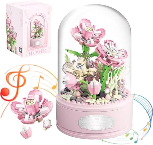 TOYS LAND - مجموعة بناء باقة جاردينيا من تويز لاند 438 قطعة مكعبات البناء الصغيرة سلسلة النباتات مع صندوق موسيقى دوار وغطاء للغبار ألعاب زهور اصطناعية لتزيين المنزل للبنات والأولاد والبالغين