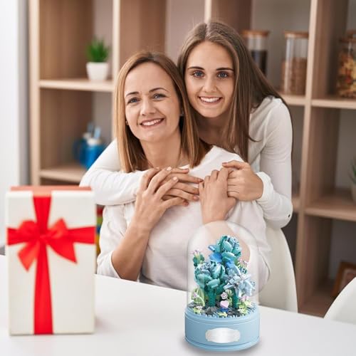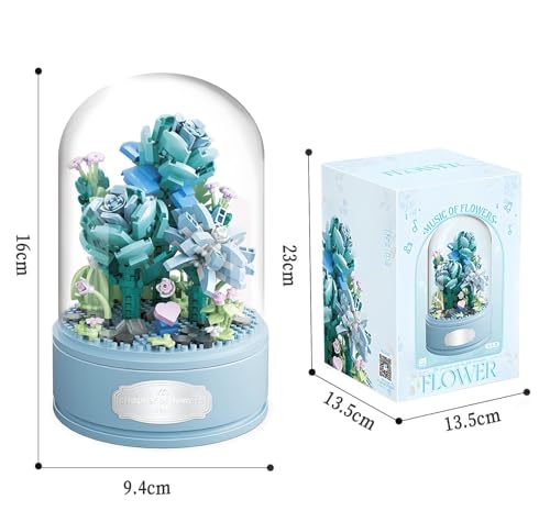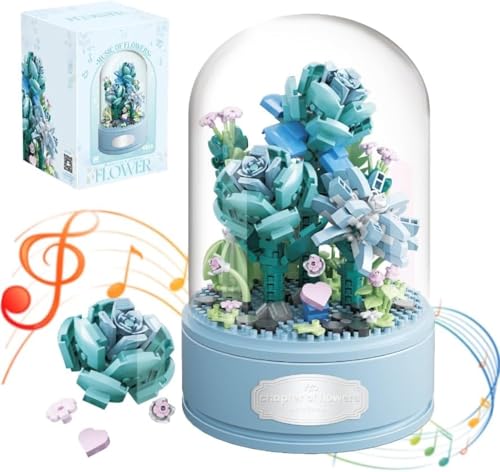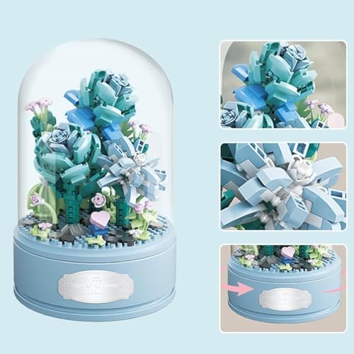 TOYS LAND - مجموعة بناء باقة ورد أزرق ووردي من تويز لاند 522 مكعب صغير سلسلة النباتات مع صندوق موسيقى دوار وغطاء غبار ألعاب زهور صناعية تصنعها بنفسك لتزيين المنزل للبنات والأولاد والبالغين