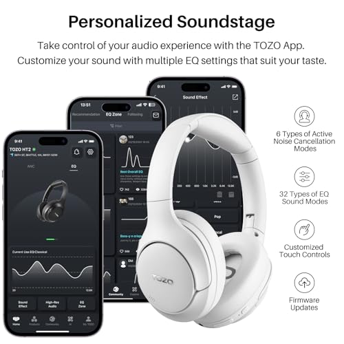TOZO - سماعات للرأس HT2 لاسلكية بتقنية إلغاء الضوضاء الهجينة النشطة، تشغيل لمدة 60 ساعة، صوت عالي الجودة وخالي من الفقد، سماعات بلوتوث فوق الأذن بصوت باس عميق قابلة للطي وخفيفة الوزن للتمارين الرياضية