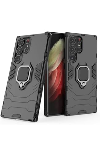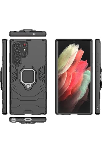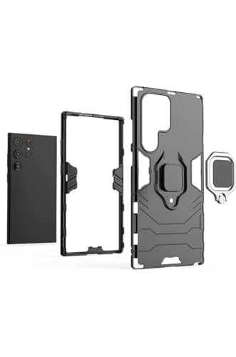 - جراب موبايل مضاد للصدمات من البولي يوريثين المقاوم للحرارة والبولي كربونات، مزود بحامل حلقي يدور 360 درجة لموبايل سامسونج جالاكسي S23 الترا(اسود)