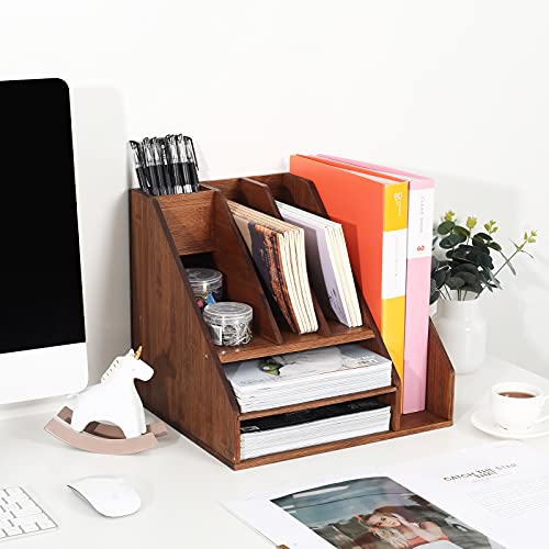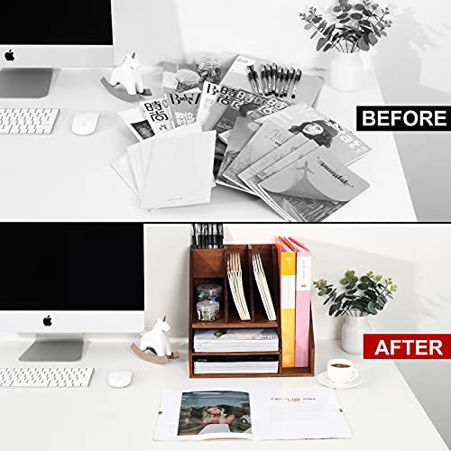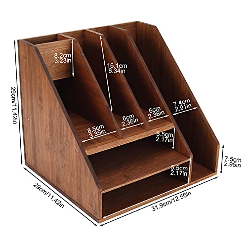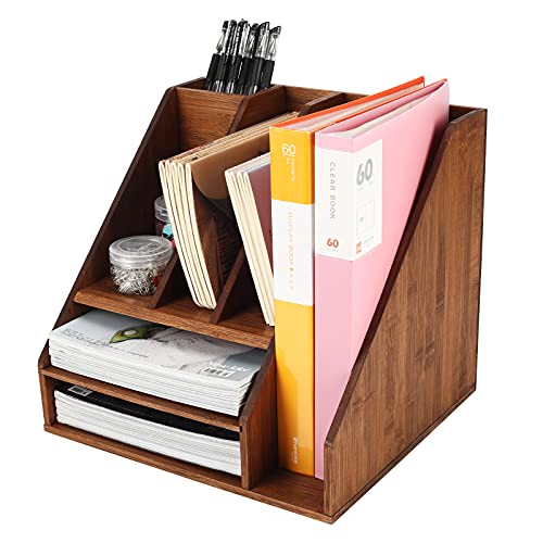 TQVAI - منظم لوازم سطح المكتب مكون من 3 طبقات من الخيزران من تي كيو في اي، حامل ملفات مع 3 أقسام لفرز الملفات وفتحة واحدة لأقلام الرصاص، بني رترو