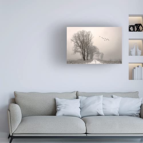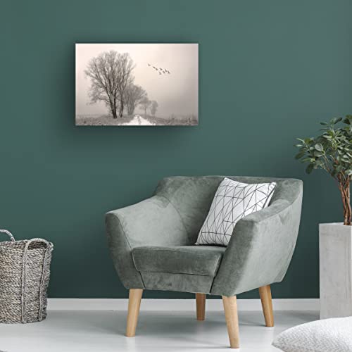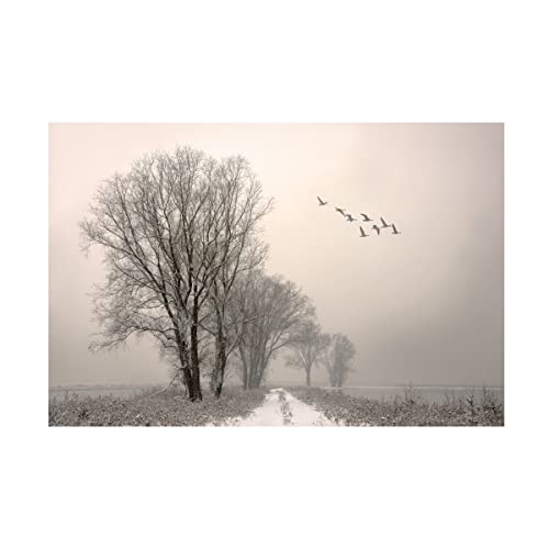 - الوصف: صورة بالأبيض والأسود للأوز تحلق فوق مسار مغطى بالثلج تصطف عليه الأشجار.