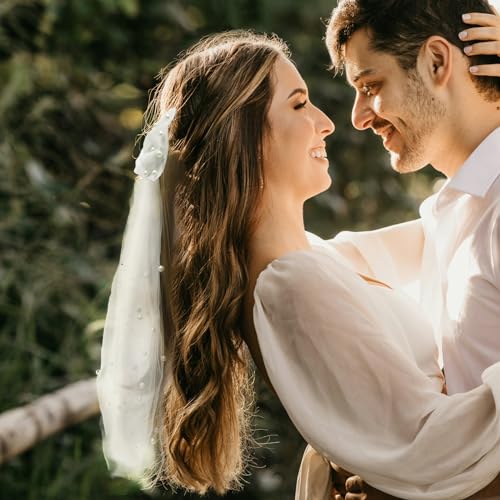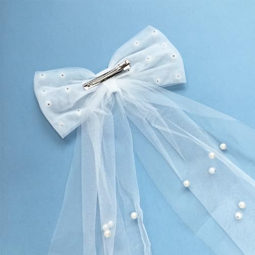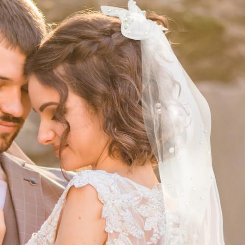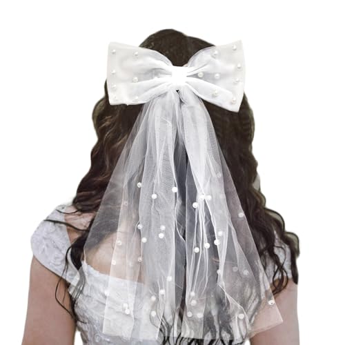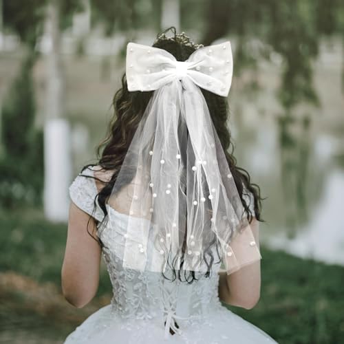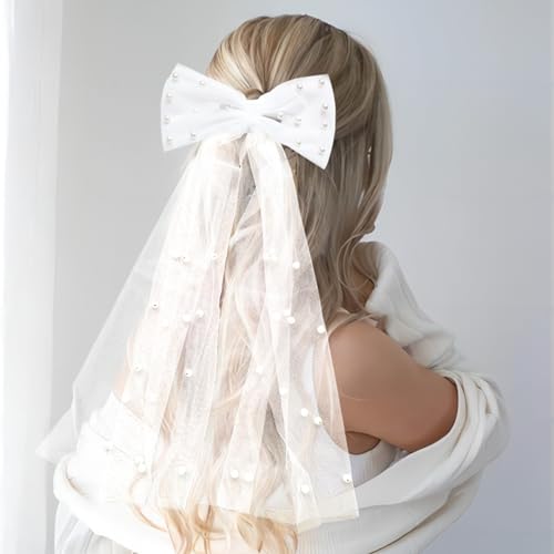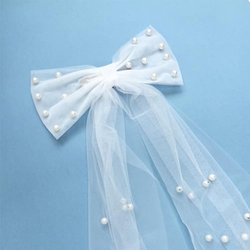 TRADERPLUS - طرحة زفاف من التول الأبيض اللؤلؤي بتصميم ربطة فيونكة من تريد بلس لاكسسوارات الشعر لحفلات العروس