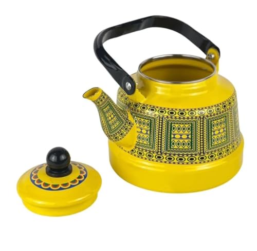 - تصميم تقليدي: غلاية شاي عربي مصنوعة بشكل جميل يتميز بقاعدة صفراء نابضة بالحياة مع نقشات هندسية خضراء معقدة لجاذبية ثقافية أصيلة.