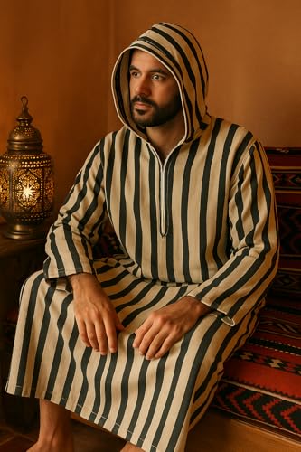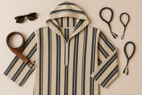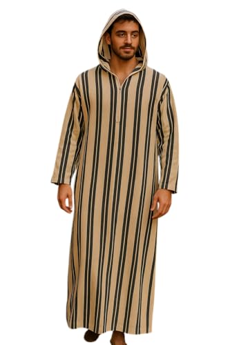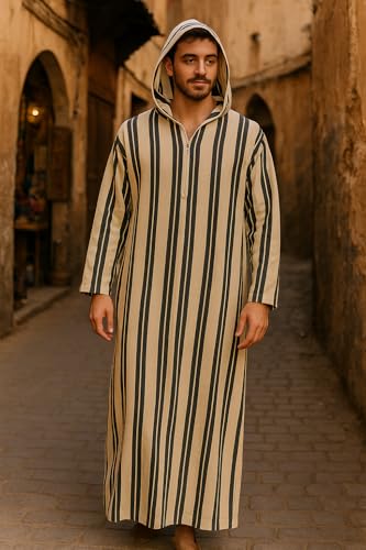 Generic - روب جيلابا مغربي تقليدي بغطاء للرأس، مخطط كريمي ورمادي، مقاس واحد