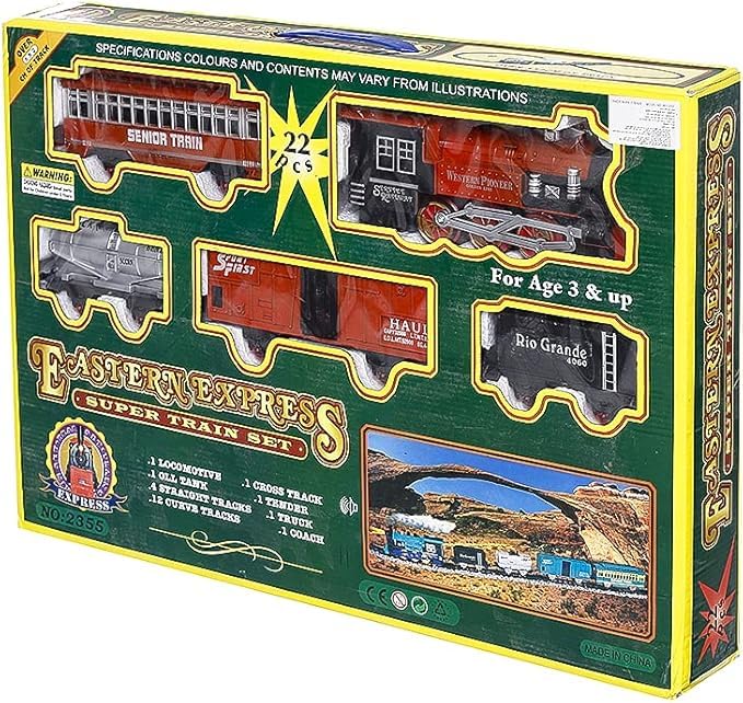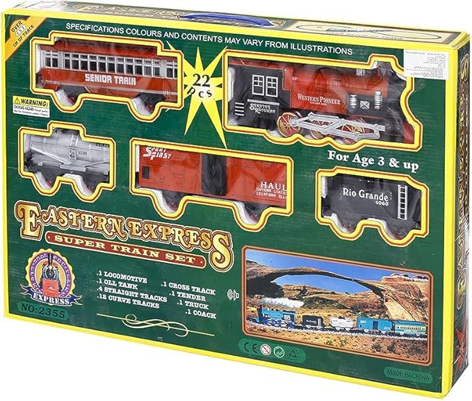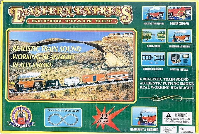 - محتويات الطقم: مجموعة قطار متكاملة تتضمن قاطرة، عربات، و22 قطعة من المسار، مع إضاءة أمامية عاملة وأصوات واقعية للقطار