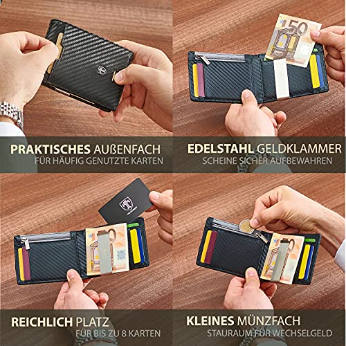 - تصميم أنيق وعملي - تتميز هذه المحفظة عالية الجودة بـ 8 فتحات للبطاقات. الجيب الخارجي يحافظ على البطاقات المستخدمة بشكل متكرر في متناول يدك. بفضل أبعادها الصغيرة، تناسب المحفظة أي جيب بنطلون