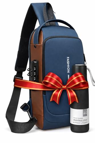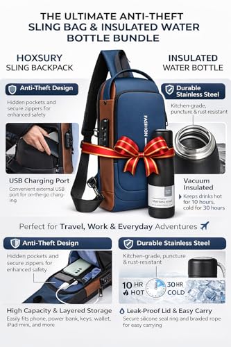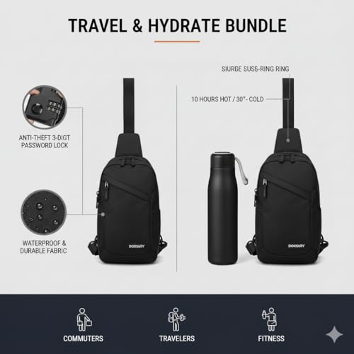 Generic - حزمة السفر: شنطة ظهر بحمالة مضادة للسرقة مع منفذ شحن USB وزجاجة مياه معزولة من الستانلس ستيل سعة 500 مل - شنطة كروس مقاومة للماء للتنقل اليومي والمشي لمسافات طويلة