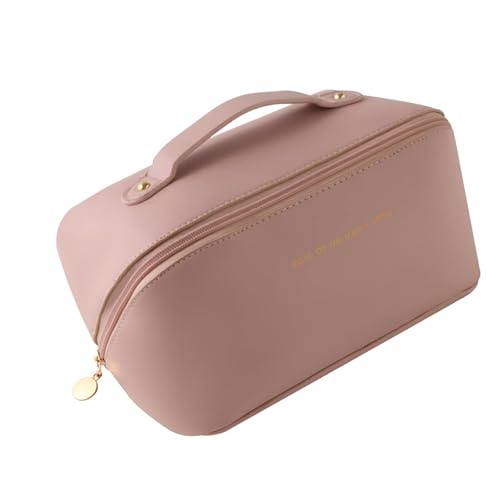 Generic - شنطة مستحضرات تجميل للسفر - منظم مكياج من جلد البولي يوريثين بسعة كبيرة مع مقبض ومقسم للتخزين بدون مجهود والسفر الانيق للنساء (بينك)