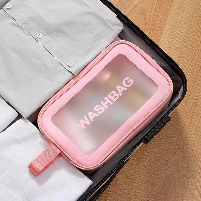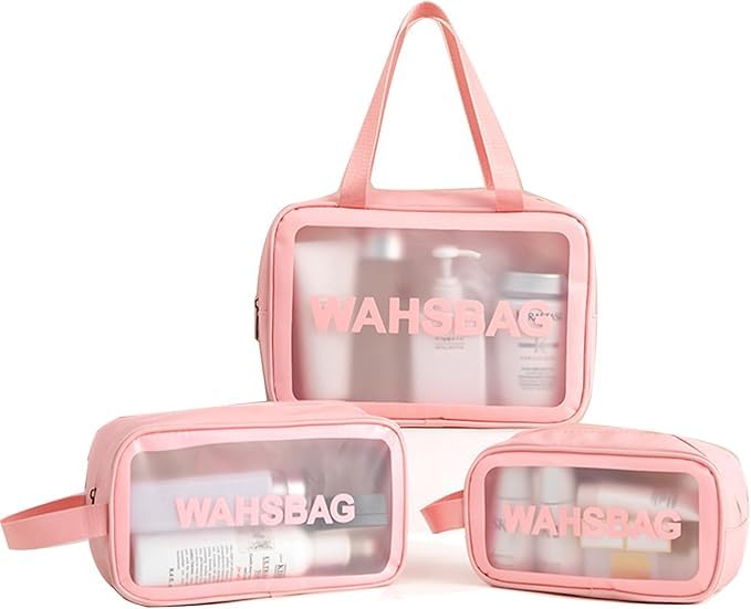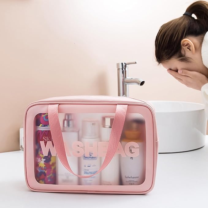 Generic - شنطة مستحضرات تجميل للسفر ادوات الزينة للنساء للرجال مقاومة للماء شفافة شنط مكياج لمستحضرات التجميل عبوة من 3 قطع بينك زهري بلاستيك بي في سي نايلون