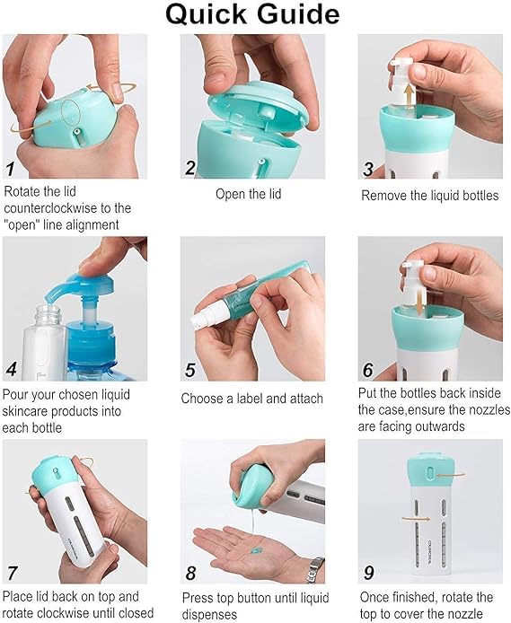 - ★ كيفية استخدام مجموعة زجاجات السفر 4 في 1؟ 1. قم بلف الغطاء العلوي عكس اتجاه عقارب الساعة وأزل الغطاء 2