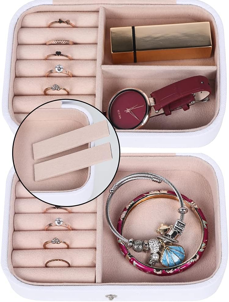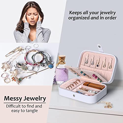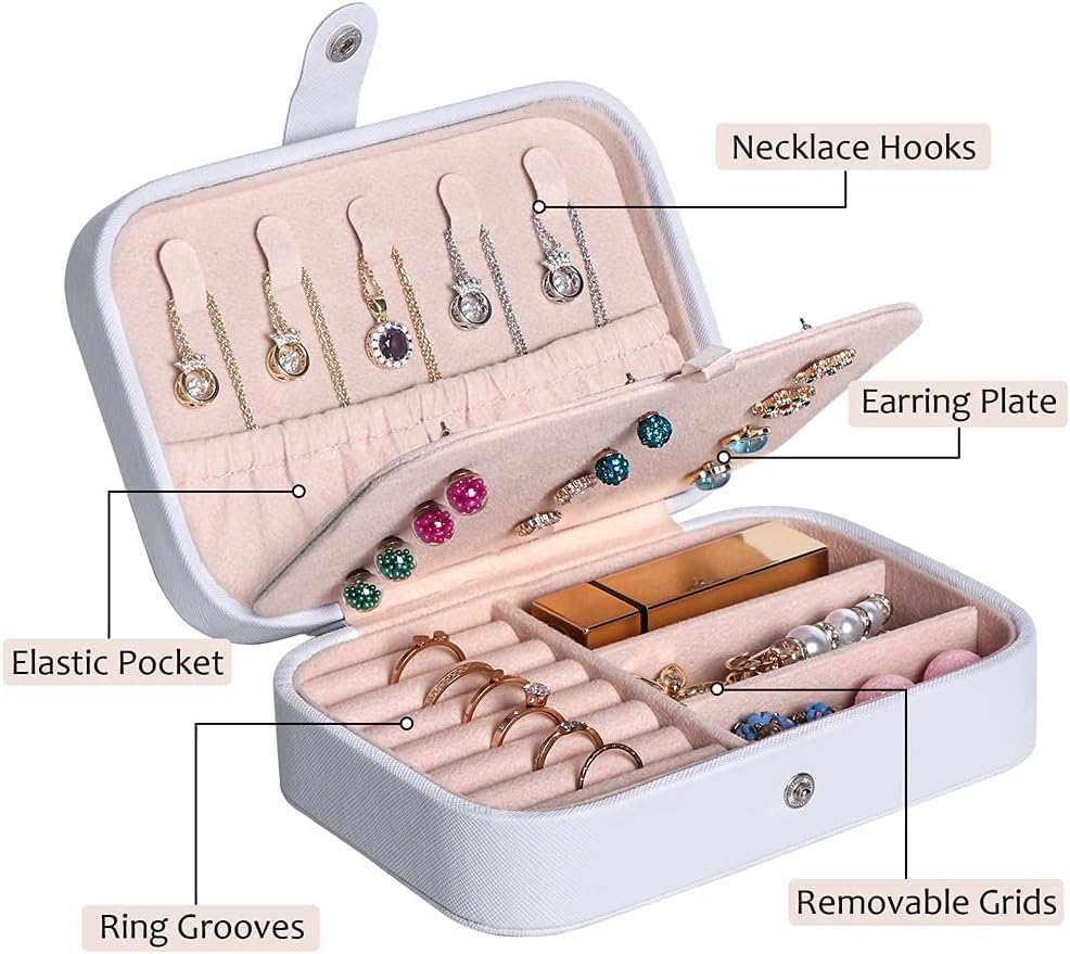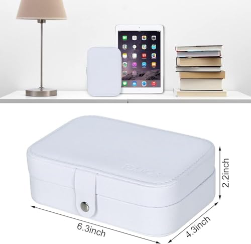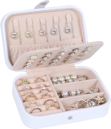 ALCOACH - صندوق مجوهرات للسفر منظم صغير من جلد البولي يوريثين للنساء والفتيات حقيبة سفر صغيرة محمولة مزدوجة الطبقات لتخزين الاقراط والخواتم والقلائد والاساور ابيض الكوتش