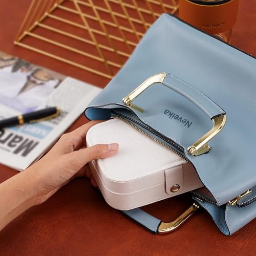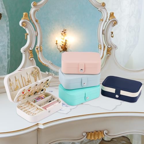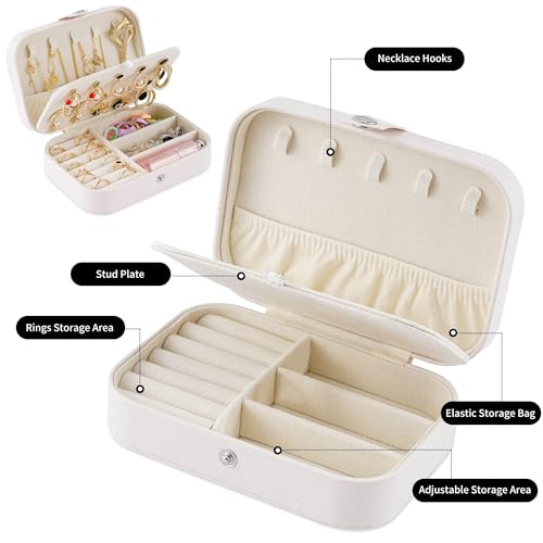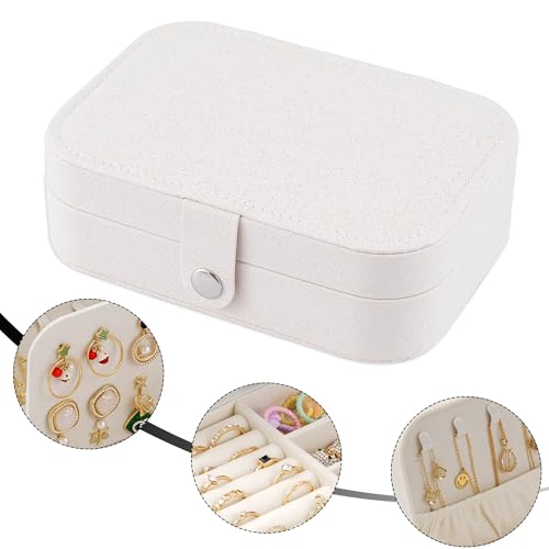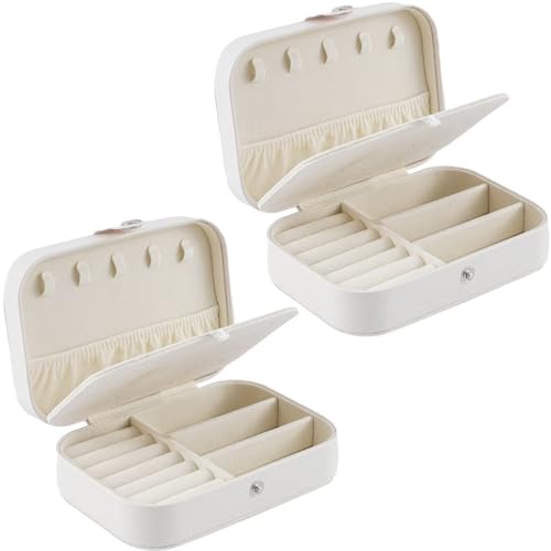 Neveika - صندوق مجوهرات للسفر، منظم مجوهرات صغير من جلد البولي يوريثين للنساء والفتيات، شنطة سفر صغيرة محمولة مزدوجة الطبقات لتخزين الاقراط والخواتم والقلائد والاساور (لون ابيض، قطعتان)