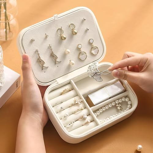 Generic - منظم مجوهرات للسفر، صندوق مجوهرات جلدي صغير للنساء والفتيات، حامل من 3 طبقات مع خطافات، تخزين مريح للحلقان والخواتم والأساور، أبيض