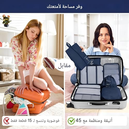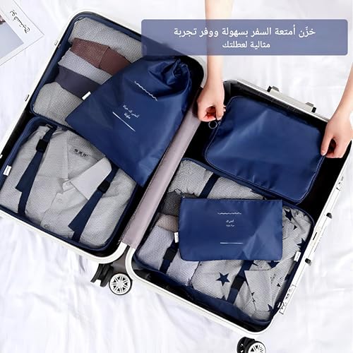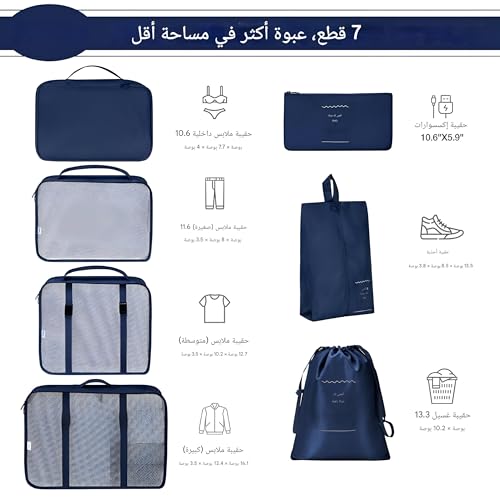 - تتضمن مجموعة مكعبات التعبئة للسفر هذه 7 شنط متعددة الاستخدامات مصممة لتنظيم جميع الضروريات، من الملابس والأحذية إلى الأدوات وأدوات التجميل، مما يضمن تجربة تعبئة مرتبة وفعالة في ظروف السفر المختلفة.