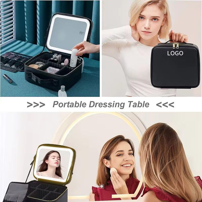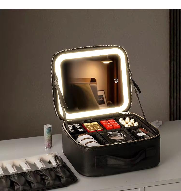 Generic - شنطة مكياج للسفر مع مراية مضيئة، 3 إعدادات للإضاءة، فواصل قابلة للتعديل، حقيبة مستحضرات تجميل لحفظ الفرش والاكسسوارات