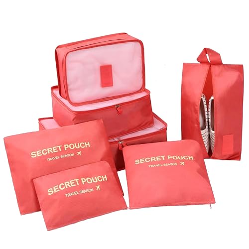 Generic - Travel Set - Seven piece cube luggage organizer with wash and cosmetic bags, made of water resistant red polyester fabric for home use