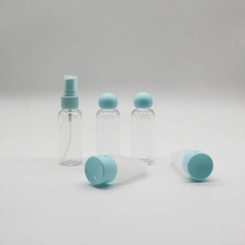 - تصميم محمول: زجاجات شفافة مع أغطية باللون الأزرق الفاتح مثالية للأمتعة المحمولة، وتتميز بإغلاق مانع للتسرب للنقل الآمن