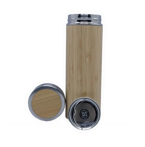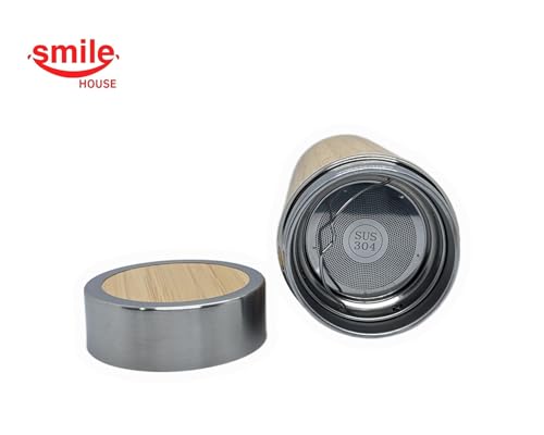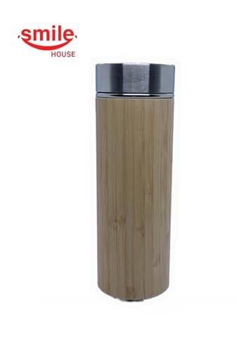 Smile House - زجاجة مياه ثيرموس للسفر - قارورة حاوية خشبية معزولة من الستانلس ستيل - غطاء مانع للتسرب ومصفاة شاي اعشاب قابلة للفصل - جدار مزدوج للمشروبات الساخنة والباردة 450 مل (بني فاتح)