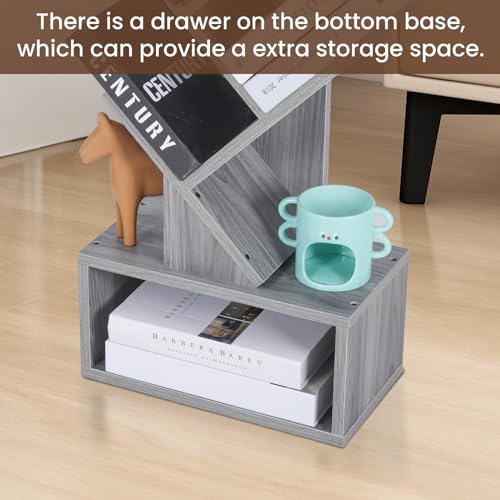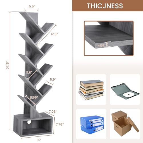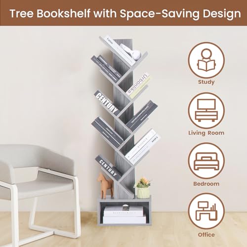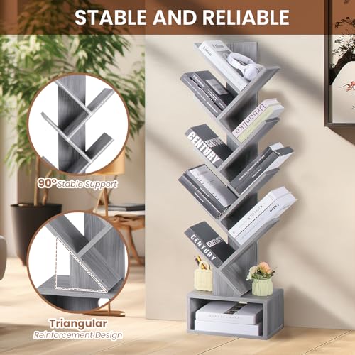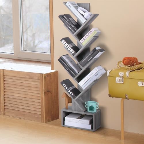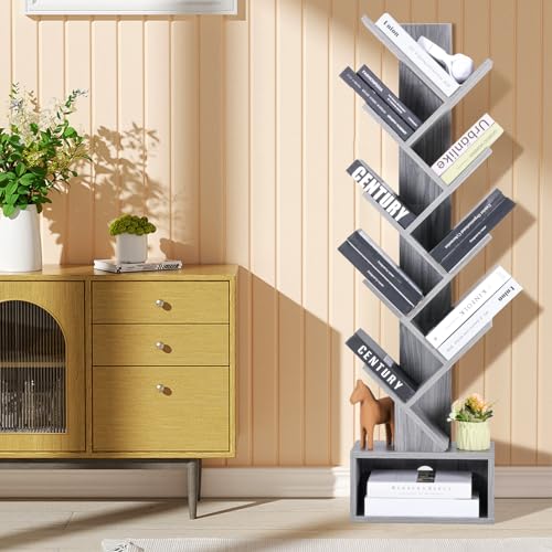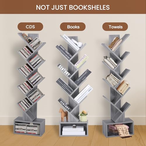 COSYSUPER - رف كتب بتصميم شجرة مكون من 8 ارفف رترو قائم على الارض مع درج تخزين خشبي طويل للاقراص المضغوطة-الافلام-الكتب منظمة للكتب لغرفة النوم وغرفة المعيشة والمكتب المنزلي رمادي داكن