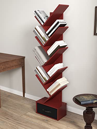 Panana - Tree Bookshelf with Drawer, 8-Tier Wooden Storage Rack Wisdom Tree Book Holder Bookshelves Organizer for Living Room, Bedroom, Home Office (Cherry)