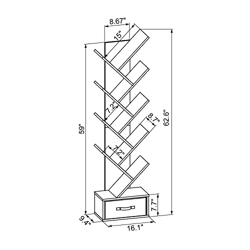 - 📘ENOUGH STORAGE SPACE: This Tree Bookshelf Is Very Compact But Comes With 8 Open Shelves And 1 Bottom Drawer. Each Shelf Can Load Up To 5-10 Books And Great For Store Books, Magazines...You Can Place All Your Treasures On It!