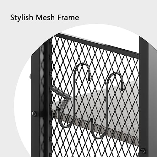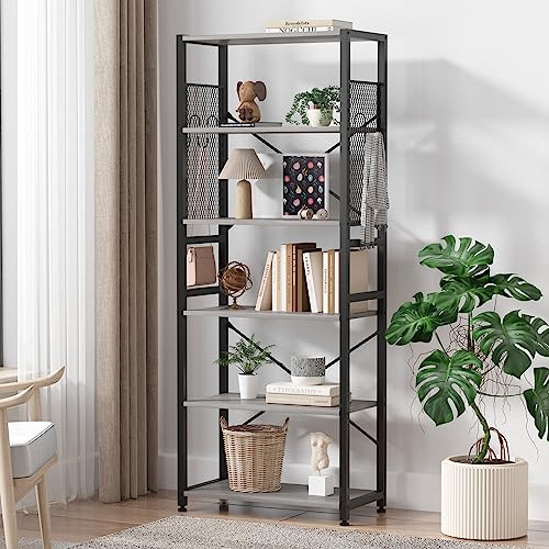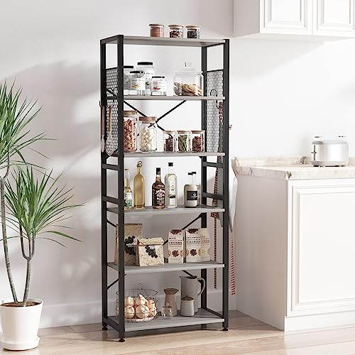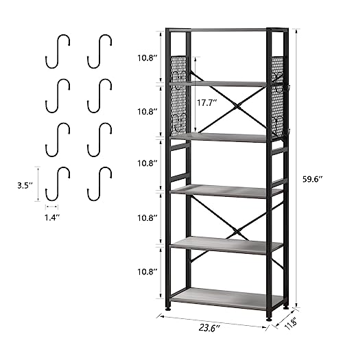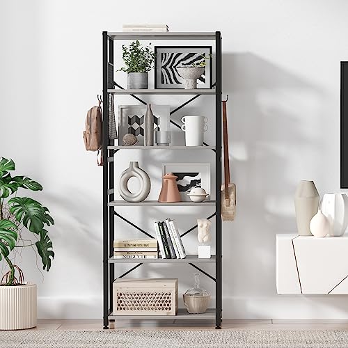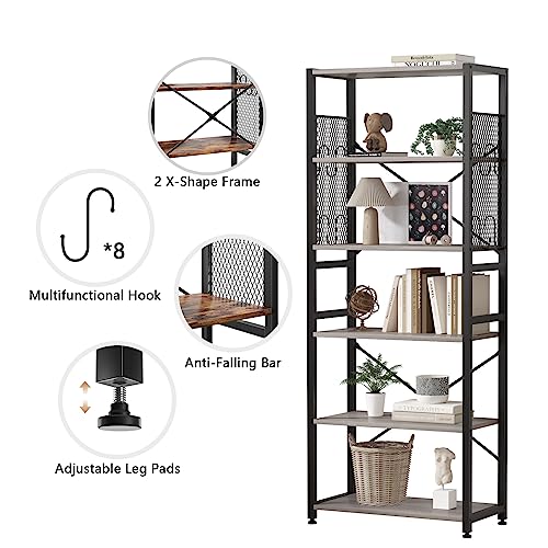 TREETALK - رف كتب من 6 طبقات تريتوك خزانة قائمة مع شريطين على شكل حرف X لوحات جانبية شبكية معدنية 8 خطافات S تخزين صناعي للمكتب وغرفة المعيشة رمادي خشب
