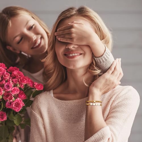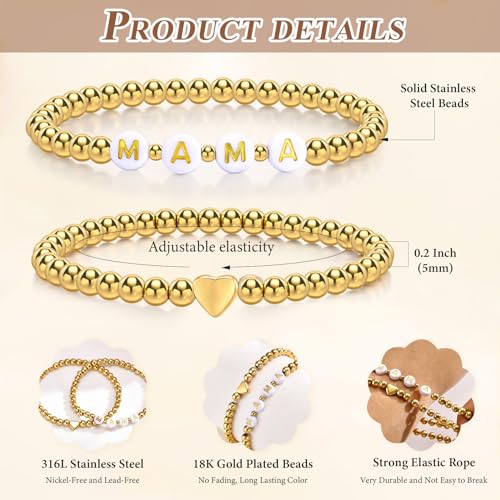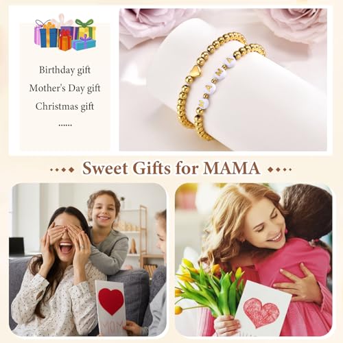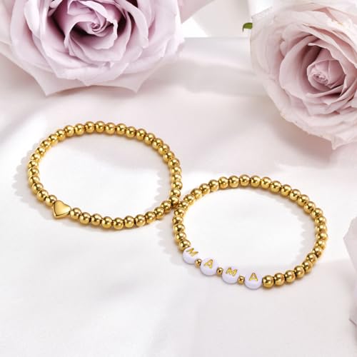 MEALGUET - أساور ذهبية عصرية للنساء: أساور قابلة للتمدد ستانلس ستيل مطلي بالذهب عيار 14 قيراط مزينة بخرز على شكل قلب للأم/الابنة/الجدة/الأخت، مجوهرات من قطعتين