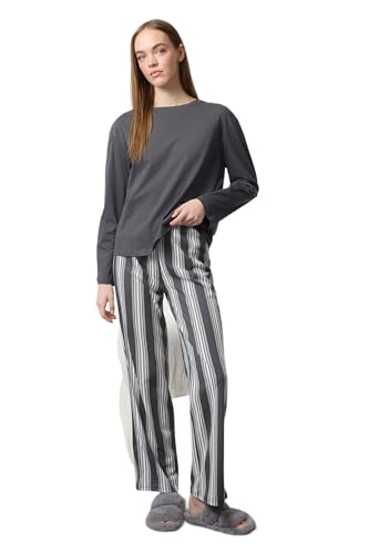 Trendyol - ترنديول طقم بيجامة قطن محبوك مخطط بلون رصاصي Thmaw25Pt00188، رصاصي، مقاس S