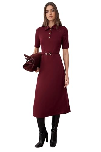 Trendyol - ترنديول فستان متوسط الطول محبوك سادة بقصة واسعة واكمام ثلاثة ارباع وحزام بلون بورغندي Twoaw26El00023، احمر كلاريت مقاس XL