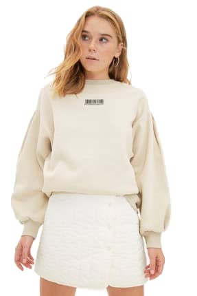 Trendyol - ترنديول سويت شيرت محبوك من الصوف السميك من الداخل بتصميم بسيط مطبوع باكمام بالون TWOAW22SW1864، لون ستون مقاس XL