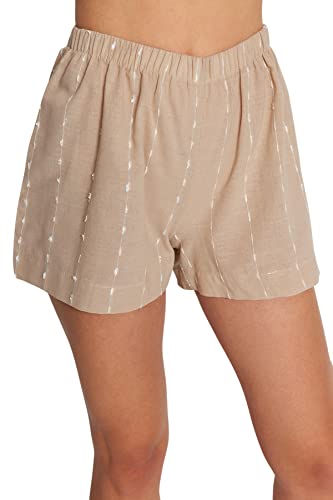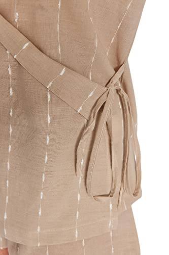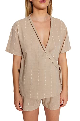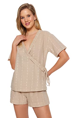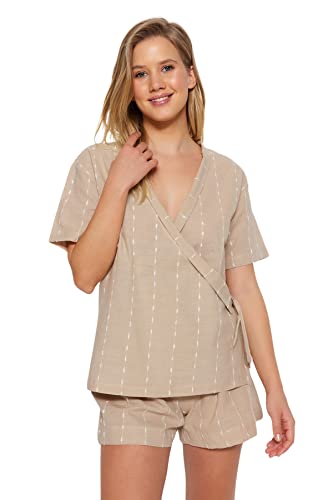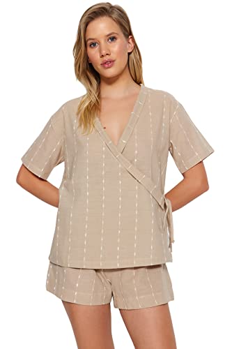 Trendyol - ترنديول طقم بيجامة منسوجة من القطن بنسبة 100% بنمط مخطط عريض للنساء، لون بيج، THMSS23PT00229، بيج، مقاس 34