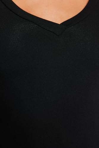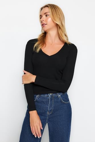 بلوزة محبوكة قابلة للتمدد من القماش الناعم الفاخر برقبة على شكل حرف V بلون أسود TWOAW24BZ00050