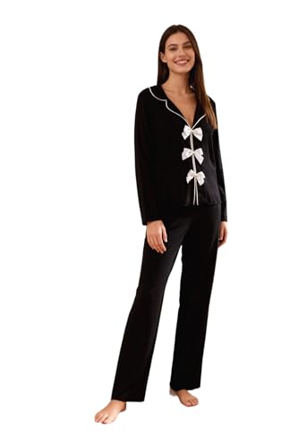 Trendyol - طقم بيجامة منسوجة من الفسكوز بفيونكة بتصميم أشرطة بلون اسود للنساء من ترينديول - موديل THMAW25PT00032
