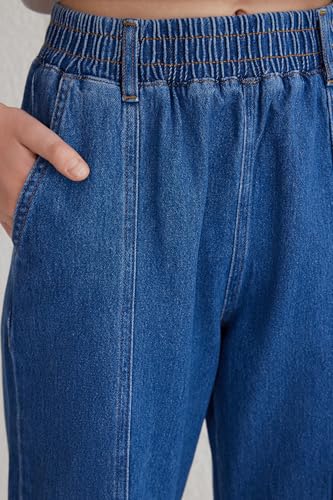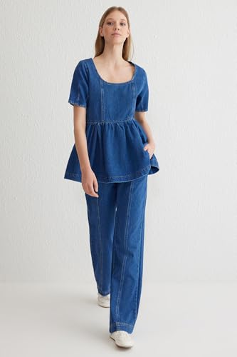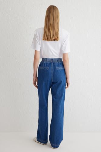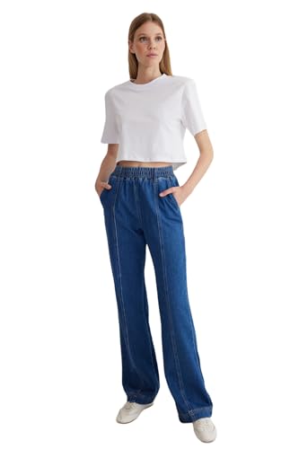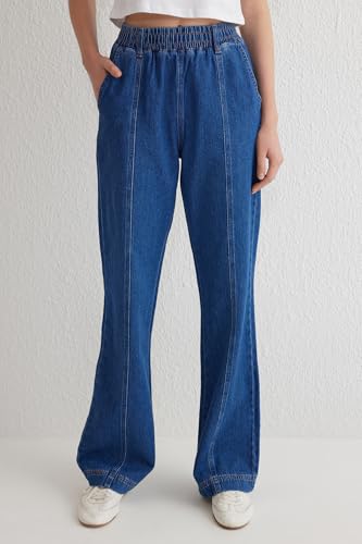 Trendyol - ترنديول بنطلون جينز للنساء بخصر مرتفع وارجل واسعة ومزين بخياطة بلون ازرق TWOSS25JE00006