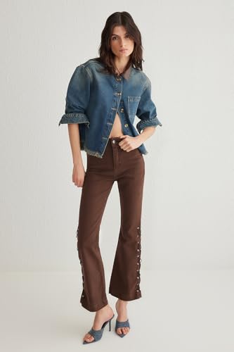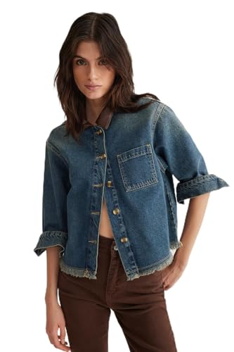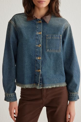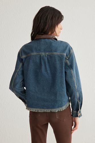 Trendyol - ترنديول جاكيت جينز نسائي ازرق داكن بحافة بشراشيب وقبة جلد متباينة وتصميم كلاسيكي قصير كبير الحجم TWOSS25CE00026