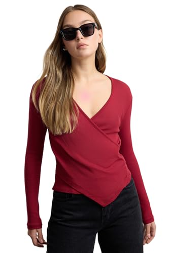 بلوزة محبوكة مضلعة قابلة للتمدد باكمام طويلة ورقبة مزدوجة الصدر TWOAW21BZ1274