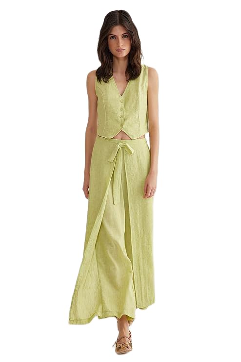 Trendyol - طقم بلوزة منسوجة بتفاصيل ربطة أمامية مع جيبة للنساء من ترنديول، لون أخضر فاتح، طراز TWOSS25AU00018